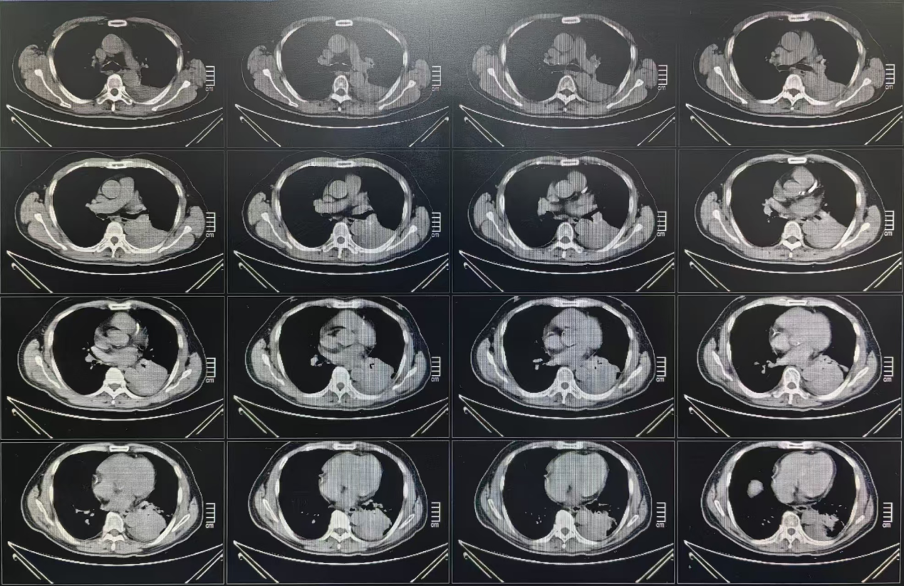 3. 2023年8月2日胸部CT示:左肺团块状高密度影(3.7*3.2cm),左肺癌性淋巴管炎可能。