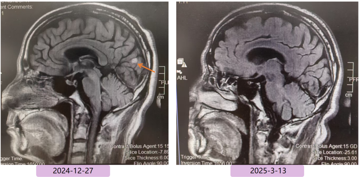 2025年3月13日头颅MRI:左侧枕叶可见结节状轻度强化影,范围约0.42×0.34cm,较2024-12-27片,病灶范围略减小,强化程度略减低,余未见异常强化影。