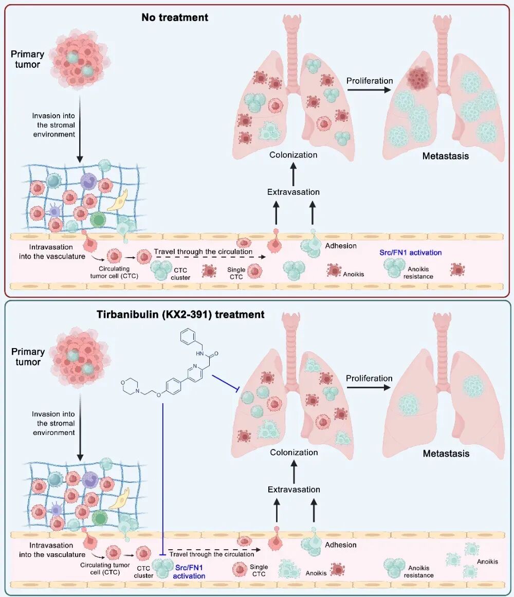 2. 转化医学前景:Src抑制剂KX2-391在临床前模型中展现出抑制转移的效果,且提示其与传统化疗(针对单细胞增殖)的互补性,为联合治疗提供理论支撑。