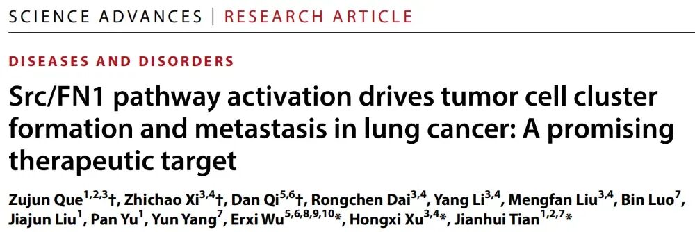 上海中医药大学附属市中医医院田建辉、上海中医药大学徐宏喜和美国贝勒医学院吴二喜等人,Science Advances发表研究成果,题为:Src/FN1 pathway activation drives tumor cell cluster formation and metastasis in lung cancer: A promising therapeutic target研究揭示肺癌转移过程中癌细胞集群的生存优势机制,为肺癌转移的防治突破提供了全新思路。
