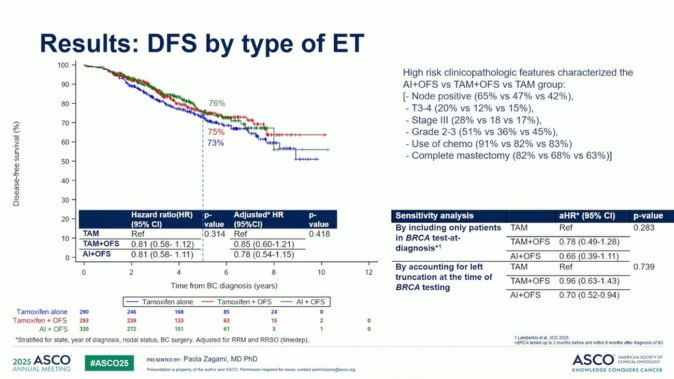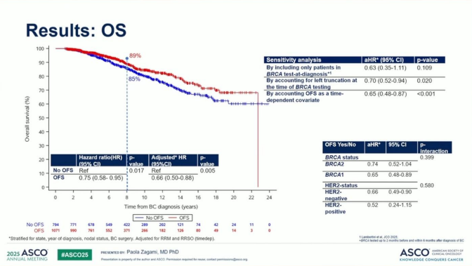 该研究纳入较大的样本量,整体人群是来自于国际上109个医疗中心的5660例患者。所有患者均为年龄≤40 岁,具有BRCA基因突变,临床分期Ⅰ~Ⅲ期,其中HR阳性乳腺癌患者1865例。在HR阳性患者人群当中,57%的患者接受OFS联合内分泌治疗(OFS+AI占比35.5%,OFS+TAM占比64.5%),其余43%患者为TAM单药治疗。中位随访7.8年结果显示,OFS联合内分泌治疗获益明显,显著改善了患者的DFS,DFS 事件发生风险降低 21%(校正 HR [aHR] 0.79 ,95% CI 0.66-0.94),同时显著改善了BCFI,风险降低 26%(aHR= 0.74,95% CI 0.61-0.89)。更为突出的是对于OS的改善,死亡风险降低约 34%( aHR=0.66 ,95% CI 0.50-0.88)6。这些数据有力地证实了OFS在BRCA基因突变的年轻乳腺癌患者中的应用价值。