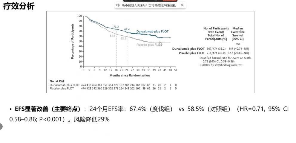 MATTERHORN研究对胃癌围手术期FLOT标准化疗方案进行了优化。这项III期研究证实,在FLOT方案中加入抗PD-L1单抗度伐利尤单抗,可显著改善可切除胃癌或胃食管结合部癌患者的无事件生存期(EFS),24个月EFS率分别为67.4% vs 58.5%(HR=0.71),风险降低29%;同时将pCR率从7.2%提升至19.2%,为围手术期治疗的升级提供了高级别证据。