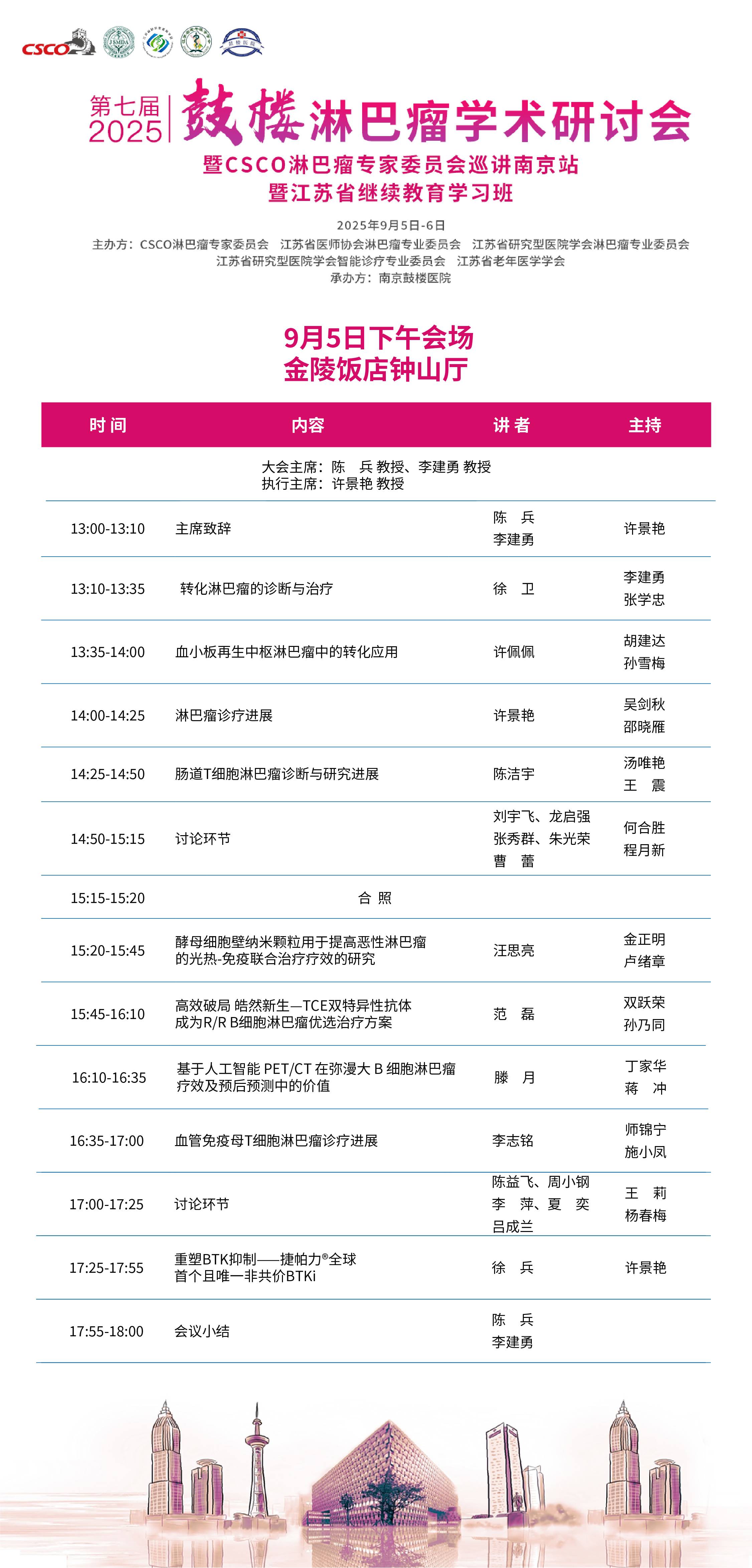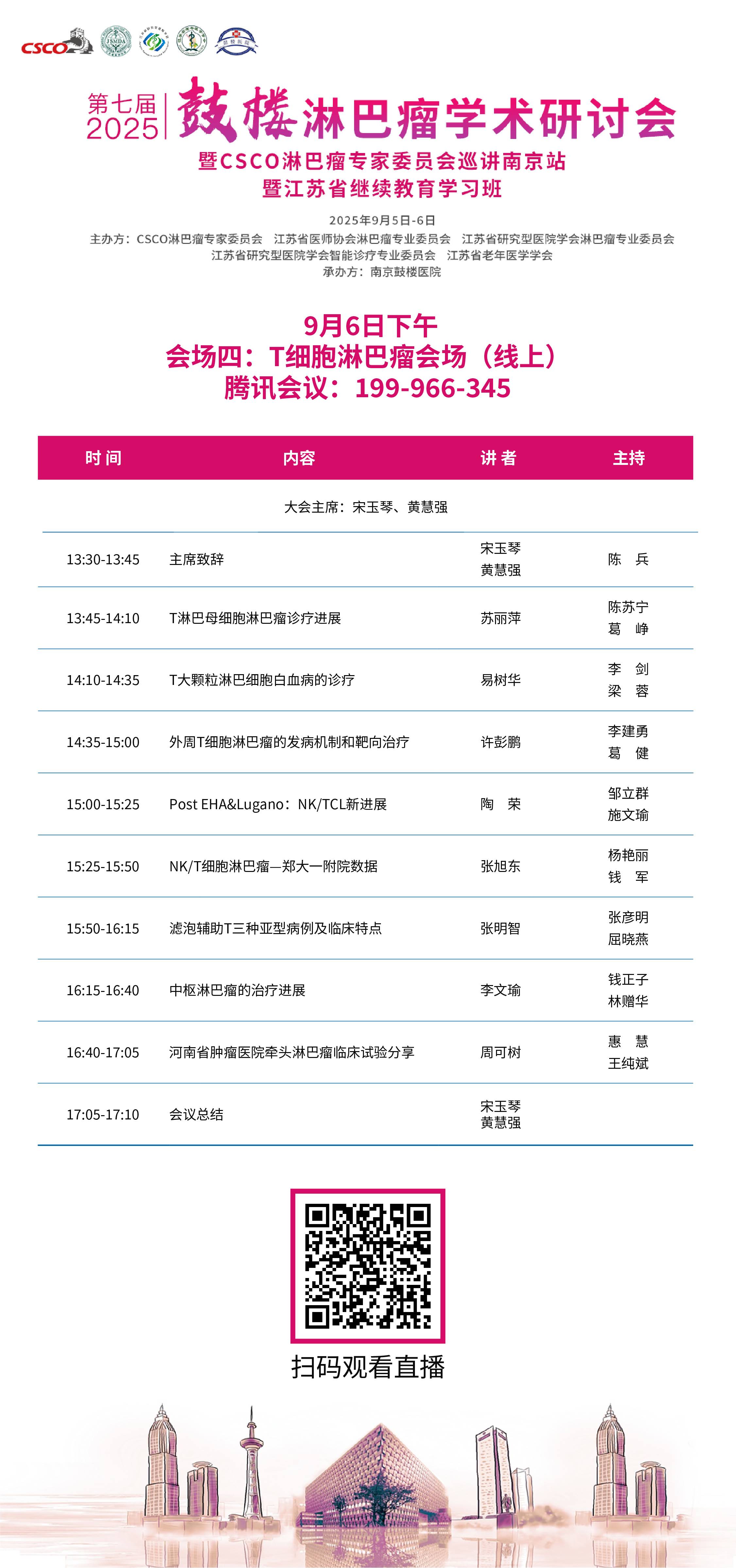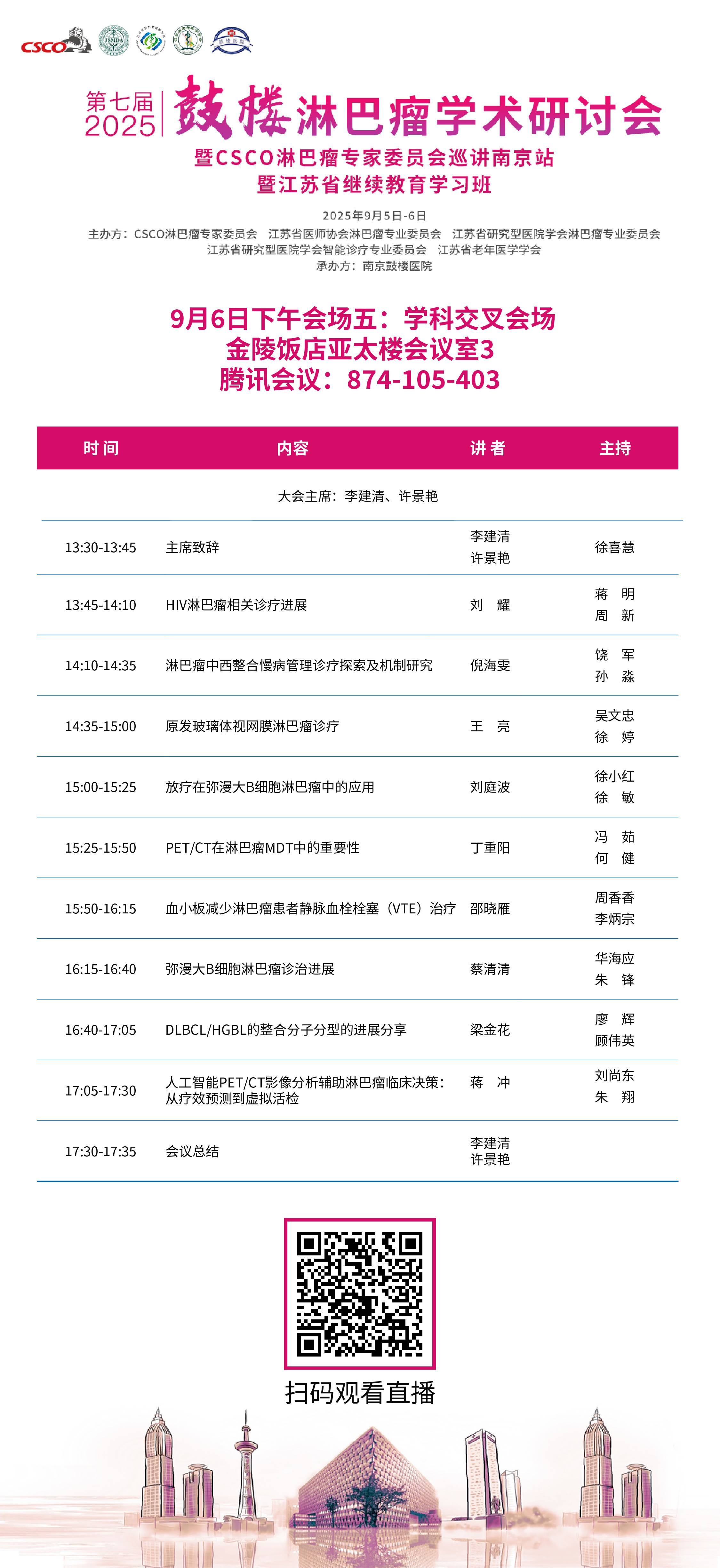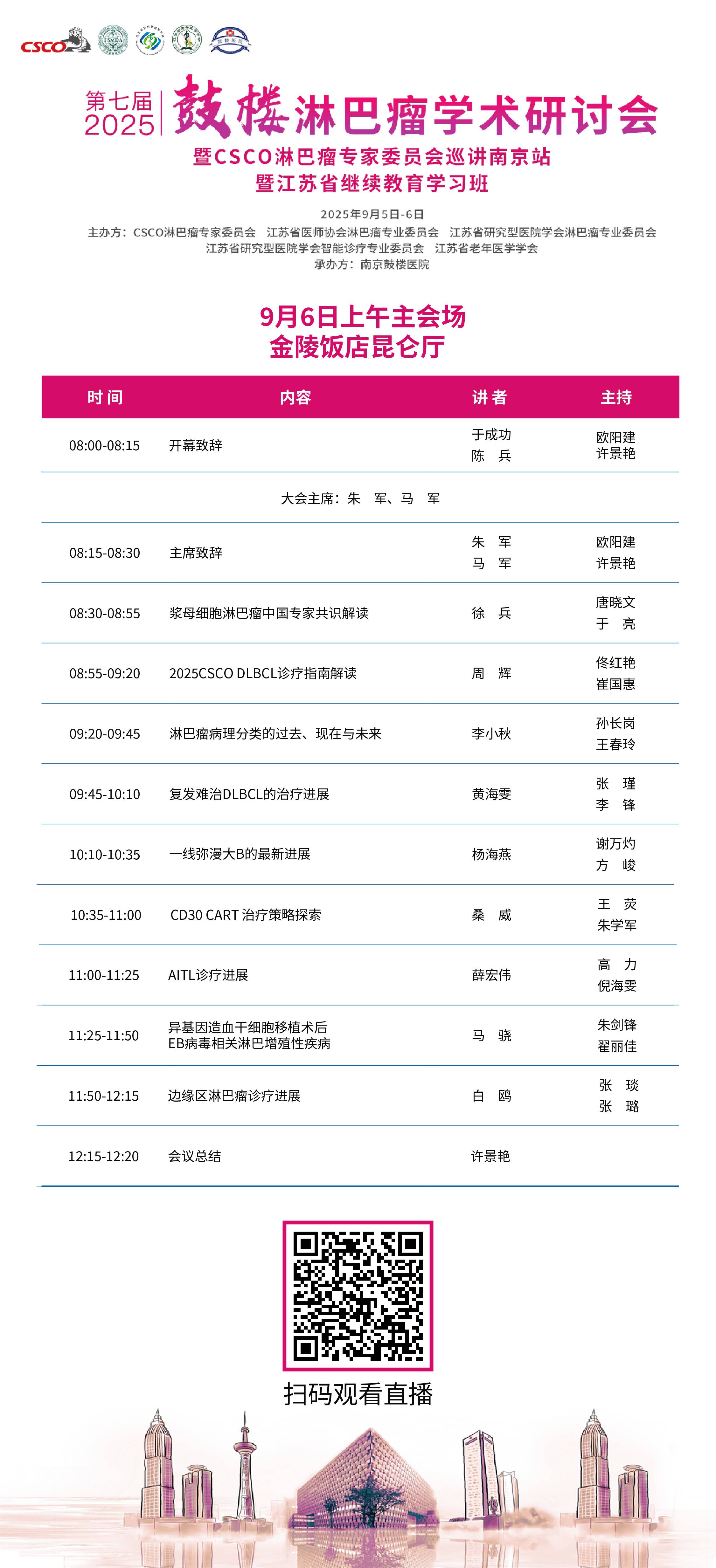 为促进国内淋巴瘤专家学术交流,进一步提高江苏省基层医院血液肿瘤学科的诊疗水平,促进淋巴瘤亚专科的建设和发展。由CSCO淋巴瘤专家委员会、江苏省医师协会淋巴瘤专业委员会、江苏省研究型医院学会淋巴瘤专业委员会、江苏省研究型医院学会智能诊疗专业委员会、江苏省老年医学学会联合主办,南京鼓楼医院承办的第七届(2025)鼓楼淋巴瘤学术研讨会暨CSCO淋巴瘤专家委员会巡讲南京站暨江苏省继续教育学习班,拟在2025年9月5日至2025年9月6日举办。会议旨在推动淋巴瘤规范化诊断和治疗。会议采用线下结合线上的形式召开。本次会议邀请了国内淋巴瘤领域的著名专家齐聚一堂。围绕淋巴瘤最新学术进展和临床诊疗中的热点问题,从学术前沿、病理诊断、多学科诊疗和转化医学等多个纬度进行深入探讨。欢迎全国血液肿瘤医生和从事淋巴瘤临床治疗、诊断学、病理学以及基础研究的专家学者及各级医师参加,同时也欢迎各单位团体届时参会,共同探讨淋巴瘤诊治的最新进展和临床治疗的规范化。