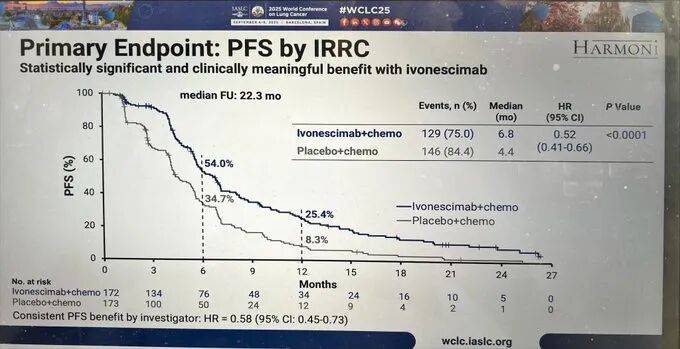 先厘清HARMONi研究的核心目标:针对三代EGFR-TKI耐药的晚期非鳞非小细胞肺癌患者,验证“依沃西单抗+化疗”是否比单纯化疗更有效。从结果看,它在“无进展生存期(PFS)”上确实交了满分答卷——联合治疗组患者病情不恶化的时间(mPFS)达6.8个月,对照组仅4.4个月,风险比(HR)0.52,统计学意义显著,相当于给患者多争取了两个多月“无进展”的安稳日子。