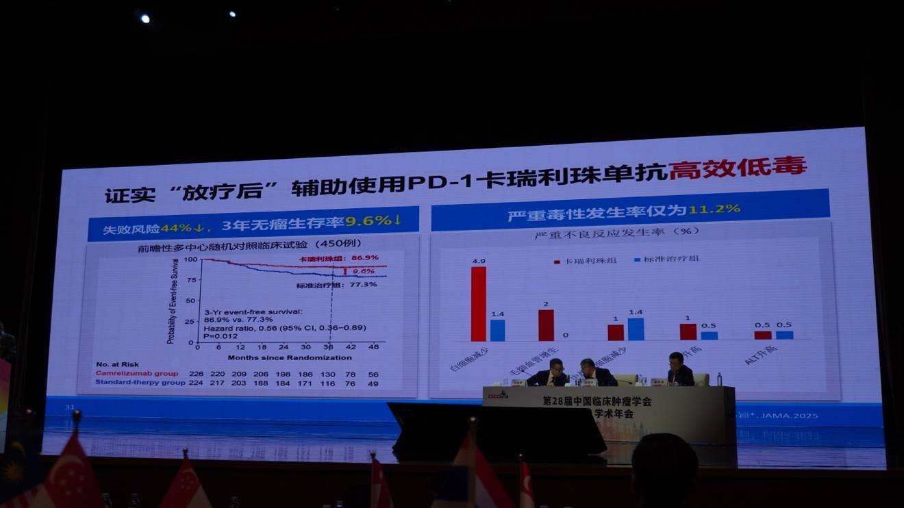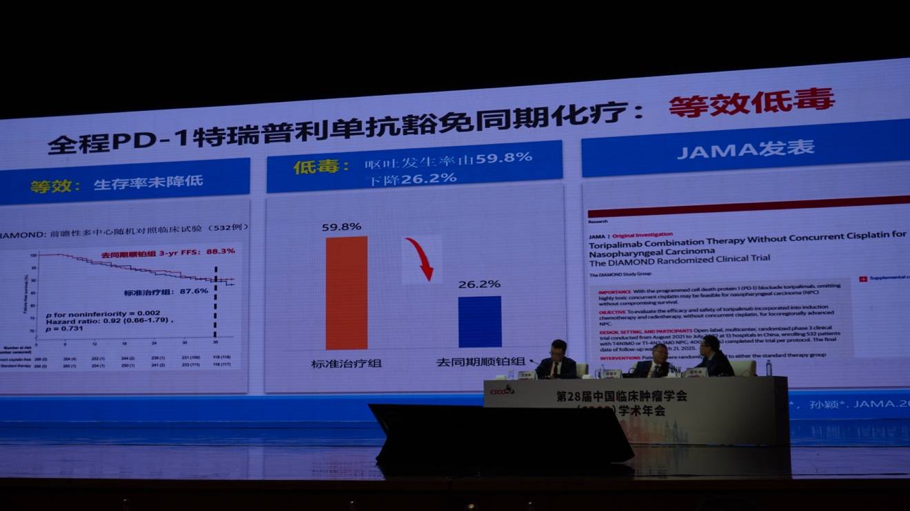 为进一步验证,团队开展了另一项III期临床试验(联合特瑞普利单抗),同样豁免了同期顺铂化疗。结果再次证实,豁免同期的生存率没有降低,但呕吐发生率从近60%显著下降至26.2%。该研究发表于《JAMA》正刊,最终确立了此“解毒”方案的有效性。