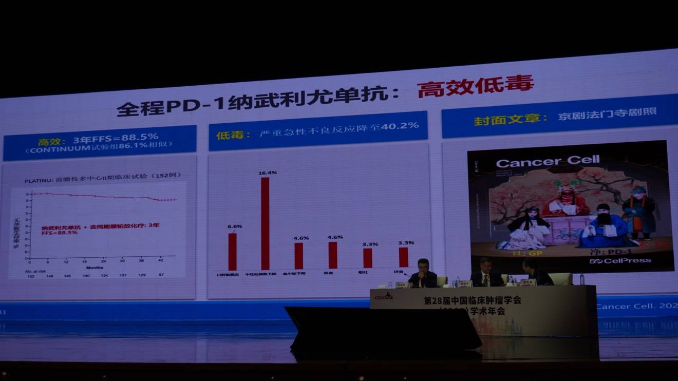 该团队首先开展了一项II期临床试验,采用全程纳武利尤单抗联合放化疗,但豁免了同期顺铂。结果显示,3年无失败生存率高达88.5%,而严重急性毒副反应发生率降至40.2%。该成果作为封面文章发表于《Cancer Cell》。其封面设计(京剧“末角小丑”鞠躬退场)象征着同期顺铂在免疫治疗时代正逐渐退出历史舞台。