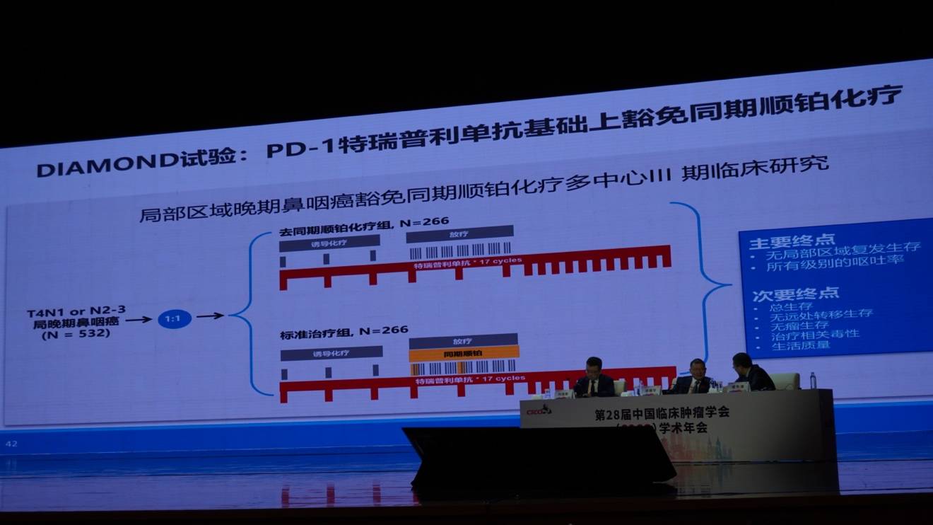 然而,与此同时马骏院士留意到,标准方案中的同期顺铂化疗(放疗期间使用3个疗程)是导致严重急性和远期毒副反应(如肾功能不全、听力障碍)的主要原因。因此,提出了在联合PD-1治疗的基础上,能否安全地“豁免”同期顺铂化疗的问题。
