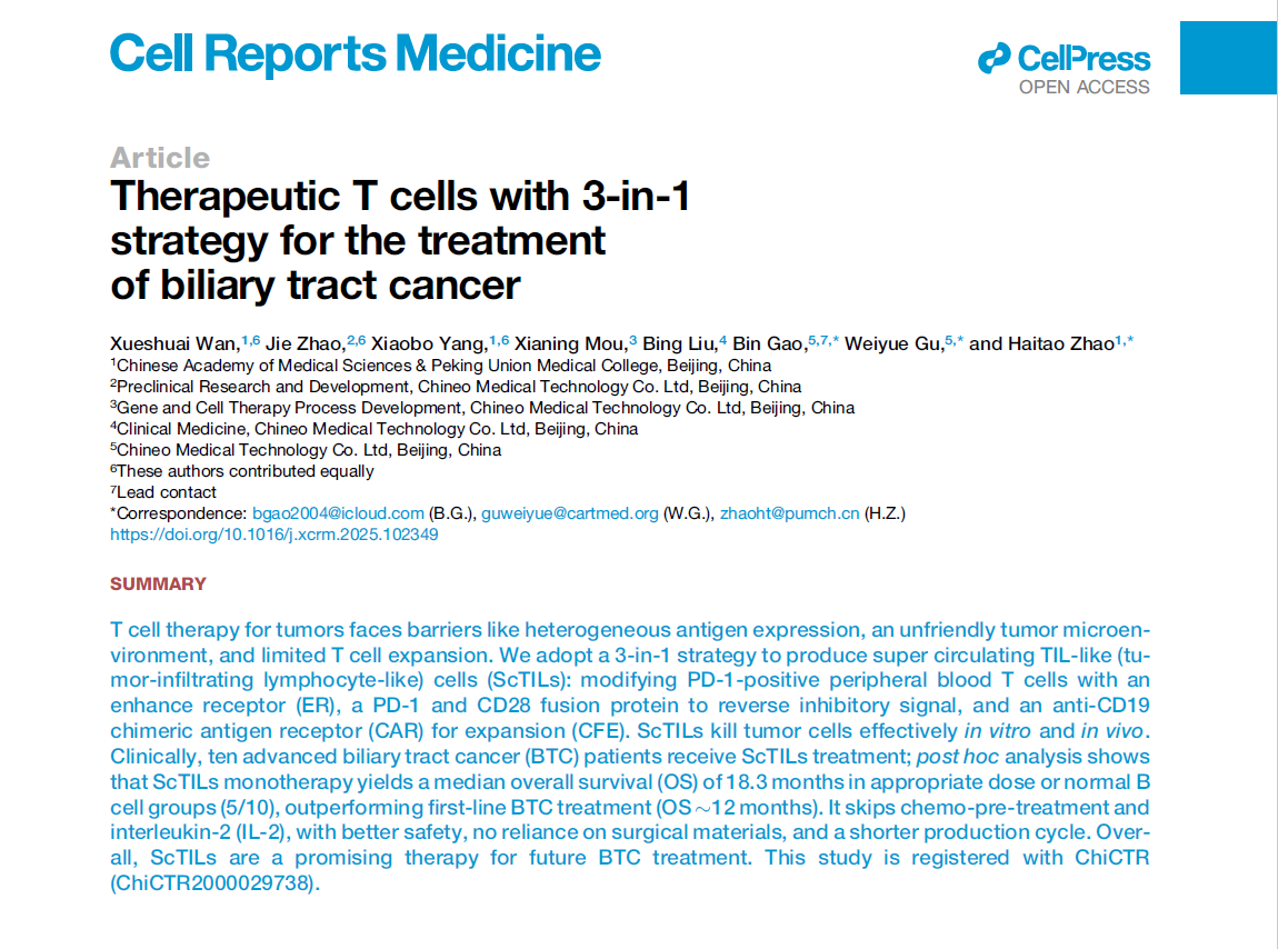 近日,中国原创的外周血类TIL细胞——ScTIL技术治疗晚期胆道肿瘤的临床研究登上CELL子刊Cell Reports Medicine。尽管这只是一个概念验证的临床研究,但在实体瘤免疫治疗领域,却是概念上的重大突破——人类首次在外周血中分离类TIL细胞并给与基因修饰,而且在恶性程度最高的癌种——胆道肿瘤上验证其临床疗效。研究数据显示,与对照组相比,ScTIL将经治无效的晚期胆道肿瘤患者的总生存期(OS)延长5倍,其OS甚至显著优于一线标准治疗。本研究的PI是北京协和医院肝胆外科的赵海涛教授,ScTIL细胞制备和技术支持由北京卡替(CHINEO)医疗技术有限公司提供。
