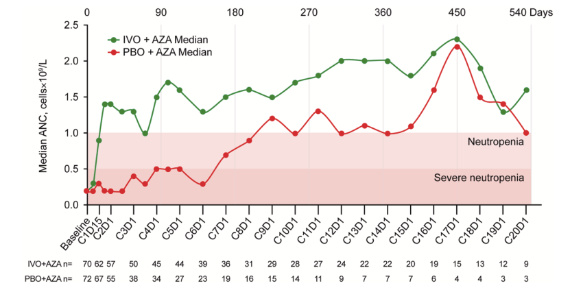 在体外IDH1突变模型和体内IDH1突变AML小鼠异种移植瘤模型中艾伏尼布可诱导髓样分化。在IDH1突变AML患者的血液样本中,特异性靶向药物艾伏尼布可降低原始细胞数,并增加成熟髓细胞的占比11。今年8月份AGILE研究更新了中性粒细胞恢复的数据分析,在AGILE研究中,IVO+AZA和AZA单药组的基线中性粒细胞绝对计数(ANC)中位值均为0.2×10^9/L。在IVO+AZA治疗组,ANC恢复明显更快,艾伏尼布快速起效,诱导细胞分化,中位ANC在第1个周期第22天恢复并稳定超过1.0×10^9/L,而AZA组的ANC直到第15周期才稳定超过这一值。与之相对应,在III期AGILE研究中,IVO+AZA组发热性中性粒细胞减少(≥3级:27.8% vs 33.8%)和感染(≥3级:22.2% vs 31.1%)的发生率均低于AZA单药组3,10。