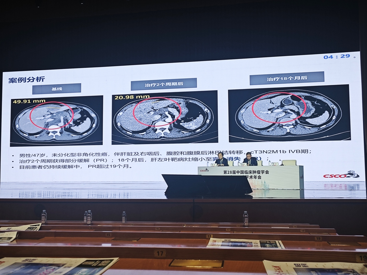 一位47岁的男性非角化型鼻咽癌患者,初诊时即为T3N2M1的IVc期,伴有广泛的肝脏、腹膜后及腹腔淋巴结转移。经过两个周期的联合治疗后,影像学评估显示病灶显著缩小。治疗18个月后,所有病灶几乎完全消失,达到CR。目前,该患者仍在持续缓解中,PFS已超过19个月。这个病例充分展示了该联合方案强大的抗肿瘤潜力。