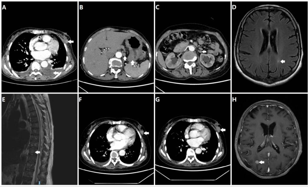 A) 胸部CT显示左侧乳房肿块(箭头所示),伴有局部皮肤增厚和左侧胸腔积液。(B) 胃壁增厚,伴胃周淋巴结肿大。(C) 肾上腺转移性结节。(D) 左侧枕叶脑转移灶。(E) 脊柱和椎体附件多发性转移灶。(F) 经过两个周期的一线化疗后,乳腺癌病情稳定。(G) 乳腺癌疾病进展。(H) 右侧大脑出现新发颅内转移灶。所有图像中的白色箭头均指示肿瘤位置。