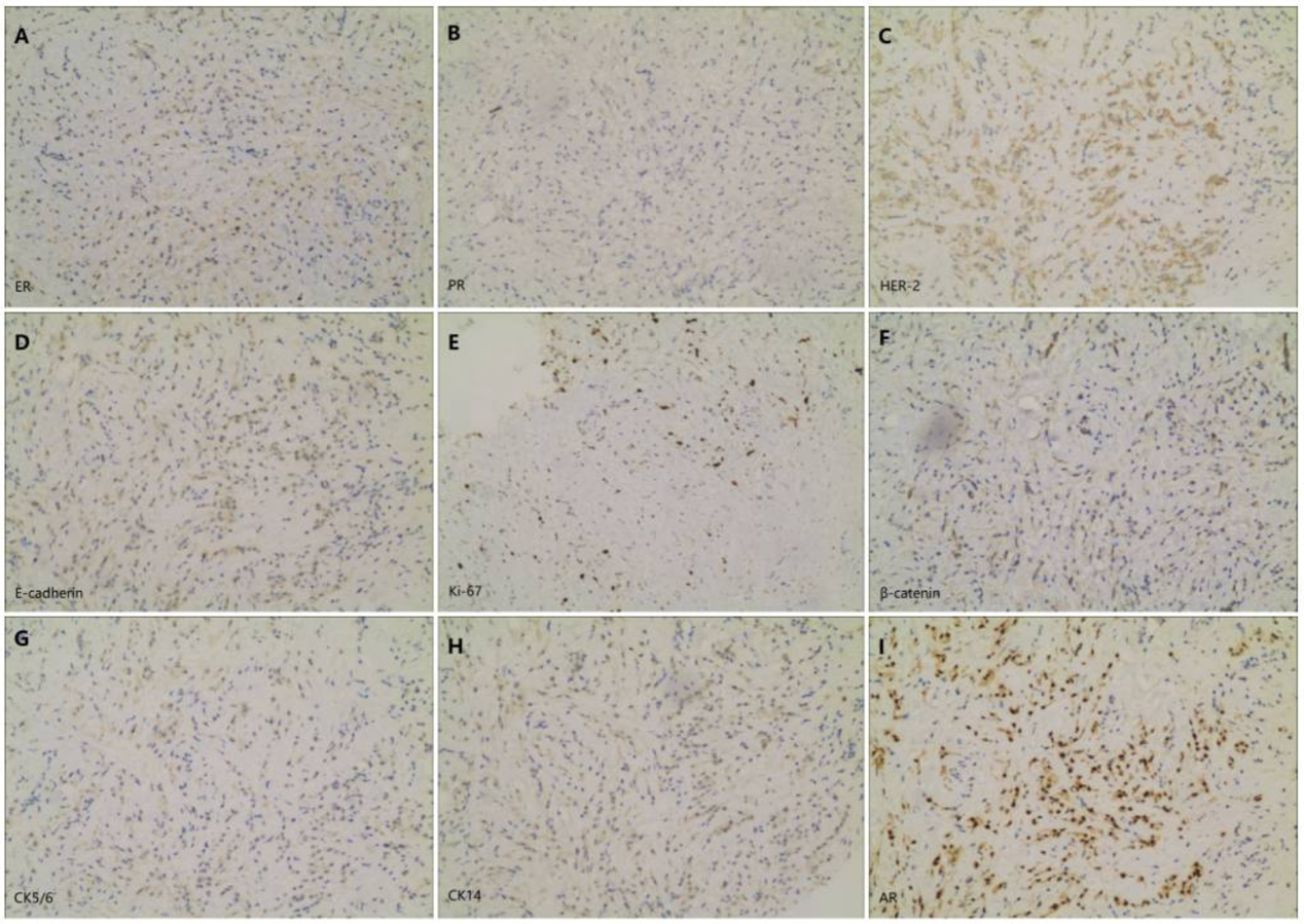 左乳肿块病理(图3):苏木精-伊红(HE)染色显示出典型的浸润性小叶癌形态学特征(图2B)。免疫组化(IHC)结果为:雌激素受体(ER)(-)、孕激素受体(PR)(-)、人表皮生长因子受体2(HER-2)(1+)、E-cadherin(-)、Ki-67(+,局部热点区达30%)、β-catenin(+)、细胞角蛋白(CK)5/6(-)、CK14(-)以及雄激素受体(AR)(++)。结合以上结果,明确诊断为经典型浸润性小叶癌,分子亚型为三阴性。