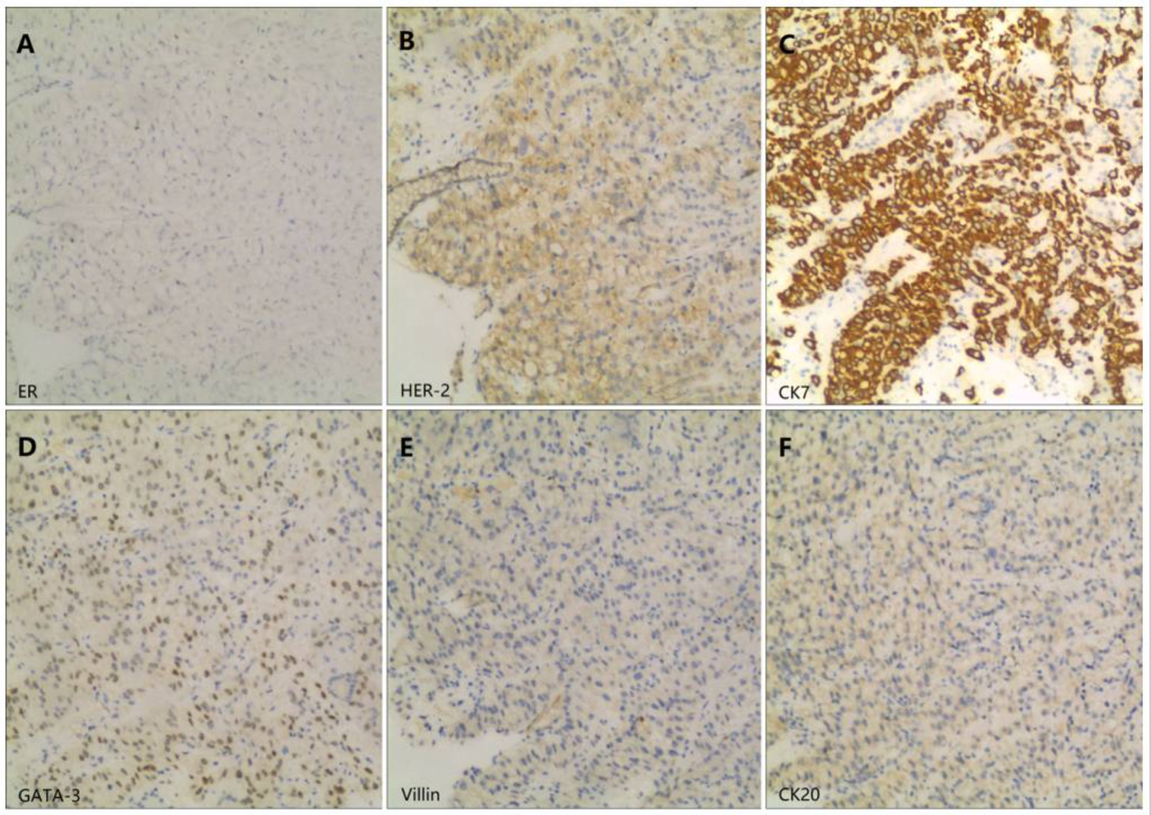 胃部病变病理(图4):HE染色提示为腺癌结构(图2C)。为鉴别其来源,进行了进一步的免疫组化检测,结果显示:ER(-)、HER-2(1+)、GATA结合蛋白3(GATA-3)(+)、CK7(++)、CK20(-)、Villin(-)。这一免疫表型组合(特别是GATA-3阳性及Villin阴性)有力地证实了胃部病变为乳腺来源的转移性腺癌。