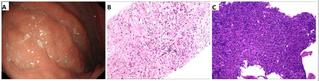 (A) 内镜视图显示胃黏膜充血、水肿,伴有浸润性病变,特征为黏膜皱襞僵硬和表面糜烂。(B) 乳腺活检组织HE染色显示出典型的浸润性小叶癌形态(放大倍数, ×10)。(C) 胃活检组织HE染色显示为腺癌(放大倍数, ×10)。HE,苏木精和伊红。