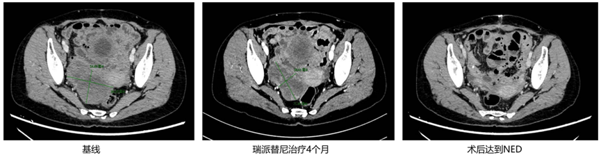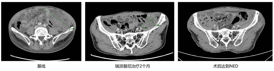 ◈ 2025年7月22日,瑞派替尼治疗4个月后进行评估,肿瘤未再次缩小(约为74mm×38mm),进行综合评估后,已达到手术标准,遂于2025年7月30日行“盆腔病损切除术+肠粘连松解术”,术后达到NED,继续服用瑞派替尼150 mg qd。