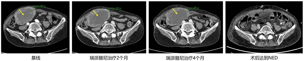 ◈ 2025年4月27日行腹腔肿瘤切除术+肠粘连松解术。术后达NED状态,继续服用瑞派替尼150 mg qd,期间规律复查,状态良好。