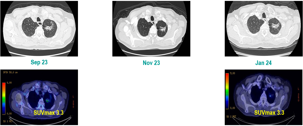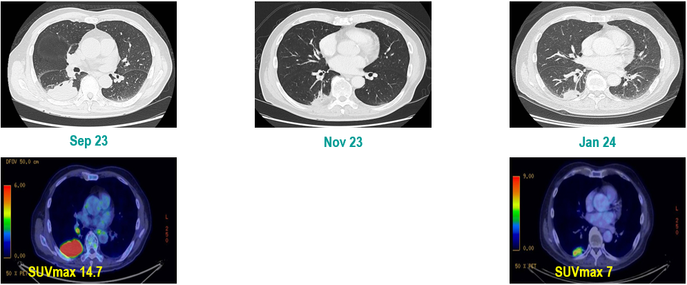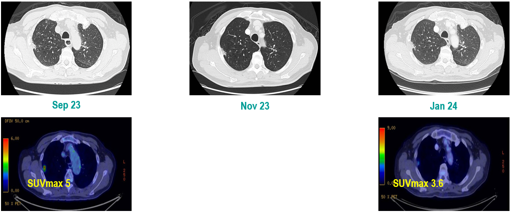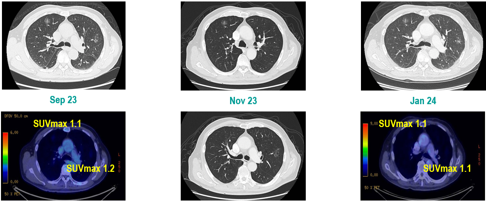 CT及PET-CT随访(2023年11月、2024年1月):评估新辅助治疗效果,右下肺叶肿块缩小,右肺门淋巴结代谢活性消失,右肺上叶结节稳定但代谢活性降低,左肺上叶及双侧磨玻璃样病变稳定。