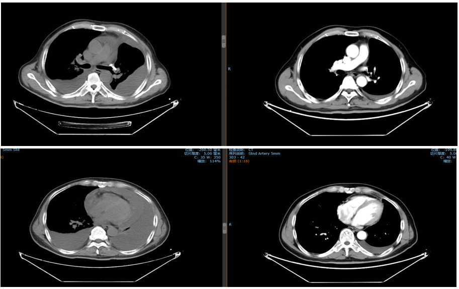靶向联合治疗(2022年1月):曲美替尼+奥希替尼治疗,后因病情进展改为曲美替尼+达拉非尼+奥希替尼联合治疗,辅以胸腔药物灌注及热疗。