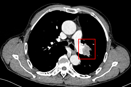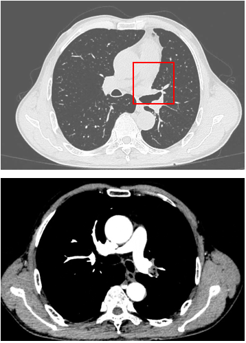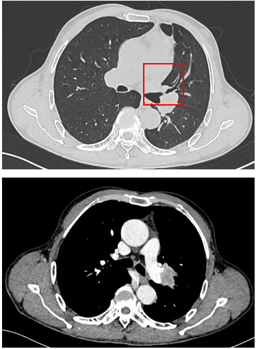 胸部CT显示左侧上叶支气管旁部发现一不规则、边界不清的软组织肿块,大小约为41mm×26mm。增强扫描后,肿瘤呈显著不均匀强化,与肿大的淋巴结粘连且难以区分,部分包裹左上叶支气管,导致管腔狭窄。左上叶肺叶间裂增厚,多个结节灶提示可能存在肺内转移。