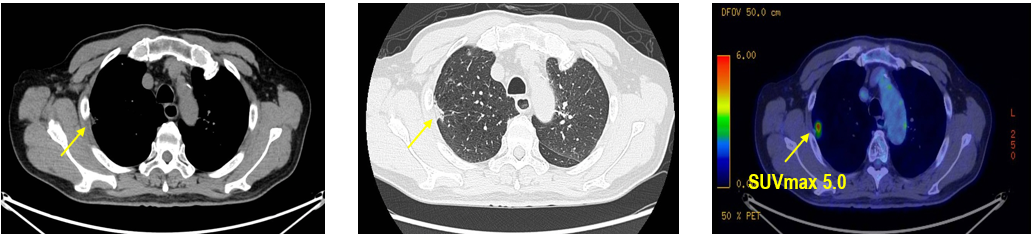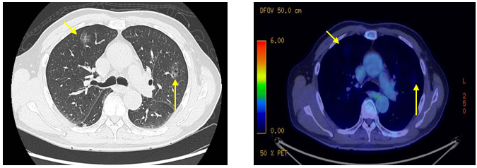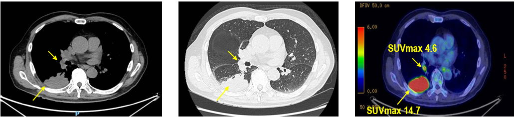 PET-CT(2023年9月):右下肺叶发现6.9×6.7×6.6cm的FDG高摄取肿块,伴右侧第7、8肋骨侵犯可疑,右肺门淋巴结肿大,双肺上叶多发结节,考虑腺癌谱系疾病。