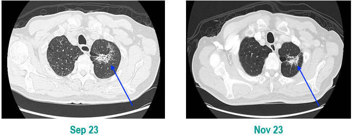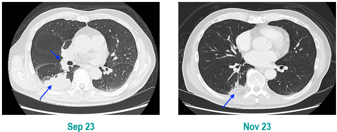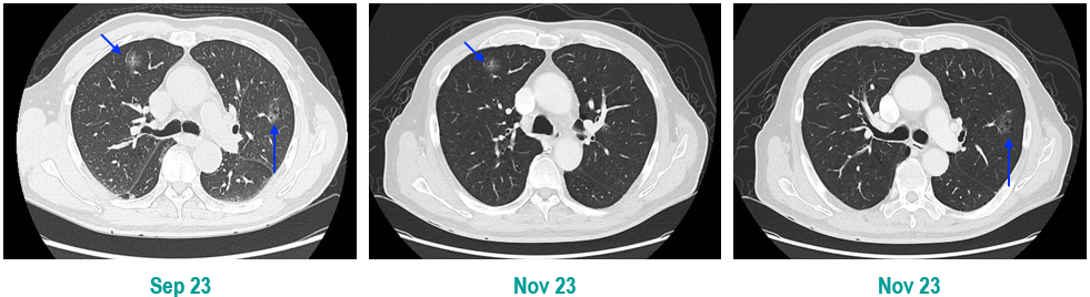 治疗缓解评估:影像学(CT)显示原发肿瘤及叶间淋巴结明显缩小;支气管镜显示左上叶开口通畅,原肿块显著退缩,可见白色坏死组织;疗效评估为PR。