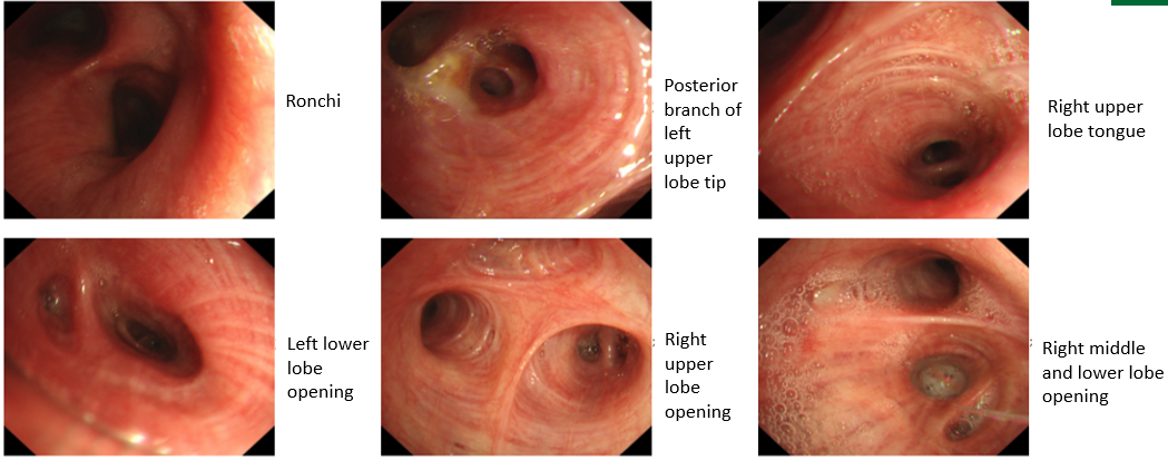 支气管镜检查显示左上叶支气管口可见一脆弱、表面粗糙的肿块,触碰易出血;活检病理提示为鳞状细胞癌。其他支气管(右上叶、左下叶等)的开口通畅,未见明显占位或其他异常。