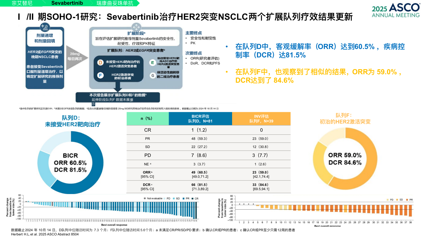 另两款新型药物Sevabertinib及瑞康曲妥珠单抗亦进展快速。在SOHO-1研究中,Sevabertinib在队列D(未接受HER2靶向治疗)的ORR为60.5%,DCR为81.5%;在队列F(初治HER2激活突变)的ORR为59.0%,DCR为84.6%。在HORIZON-LUNG研究中,ADC药物瑞康曲妥珠单抗的ORR达74.5%,DCR高达98.9%,mPFS为11.5个月6,7