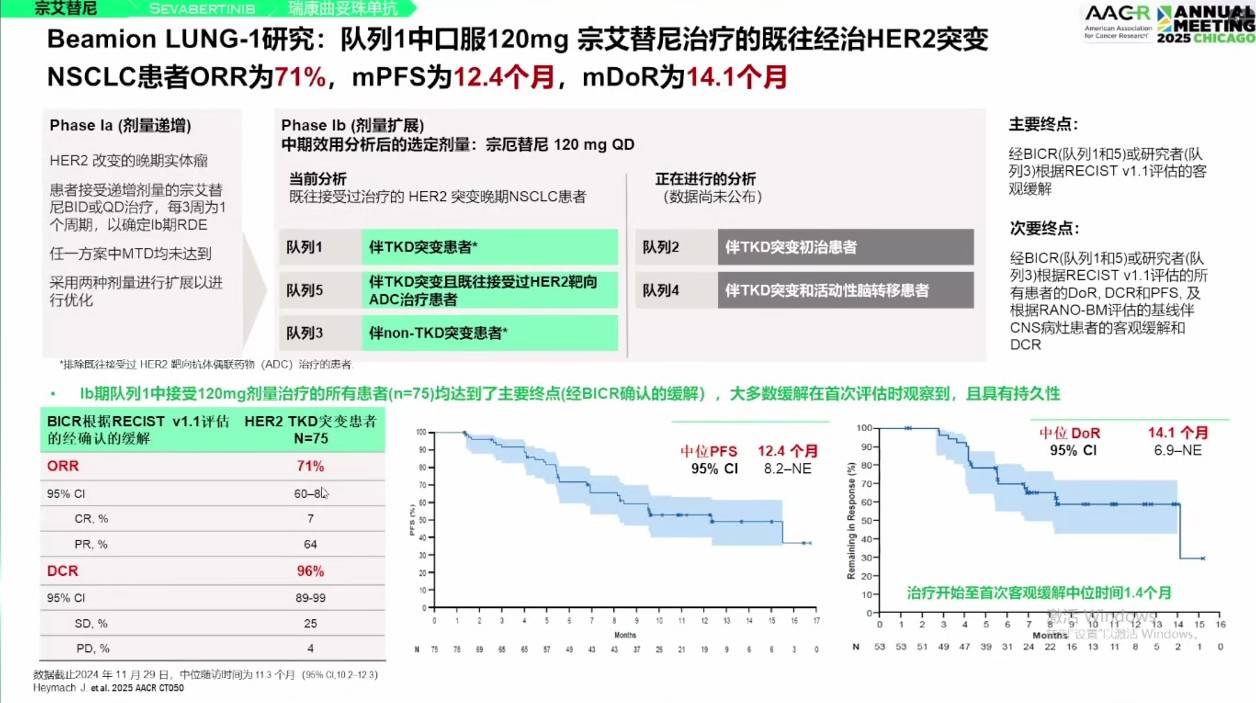 在Beamion LUNG-1研究中,宗艾替尼显示出显著的抗肿瘤活性及良好的安全性。队列1患者(N=75)接受宗艾替尼120 mg治疗后,客观缓解率(ORR)达71%,中位无进展生存期(mPFS)为12.4个月,中位缓解持续时间(mDoR)为14.1个月。在伴有脑转移的患者中,宗艾替尼亦表现出颅内活性,经RANO-BM评估的颅内ORR为41%,疾病控制率(DCR)为81%。安全性方面,药物相关不良事件(AEs)多为1–2级,3级及以上治疗相关不良事件(TRAEs)发生率仅为17%5