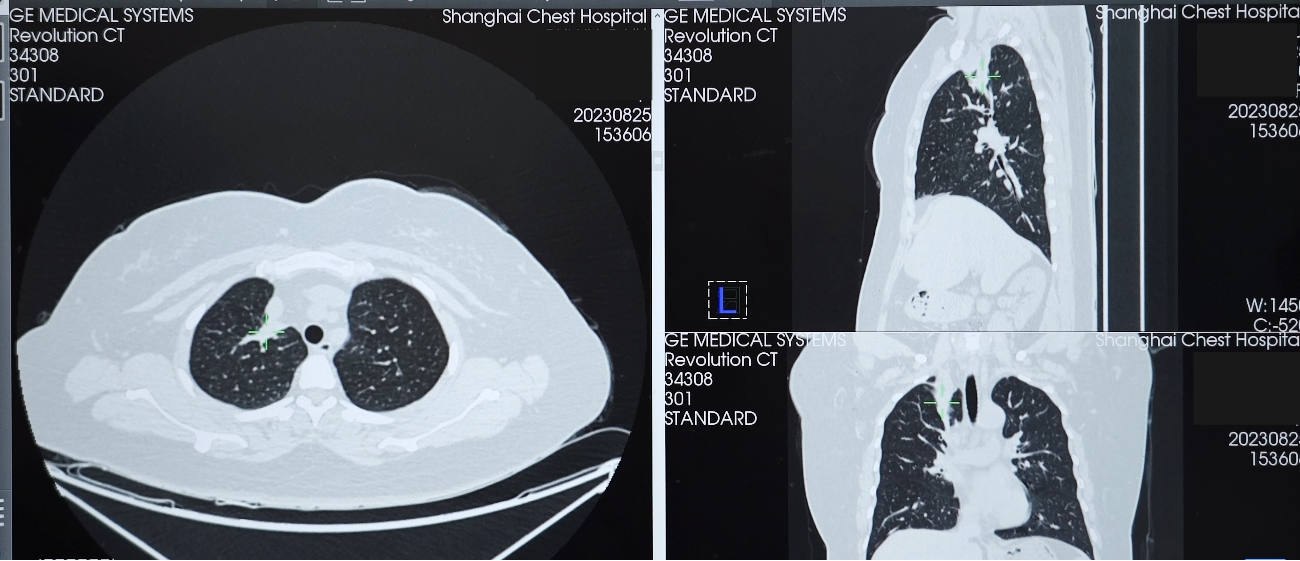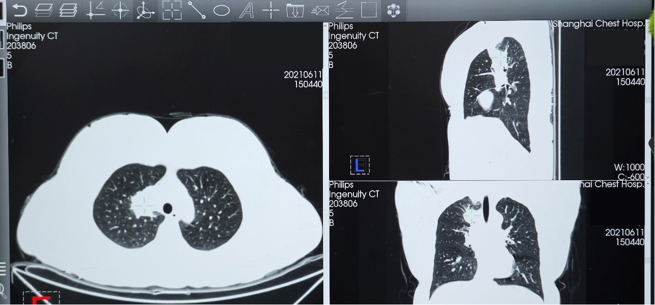 ● 胸部CT(2021年6月11日):右肺上叶实性肿块影,大小约34×33mm,考虑肺癌;右肺门及纵隔淋巴结肿大。两肺多发微小结节。