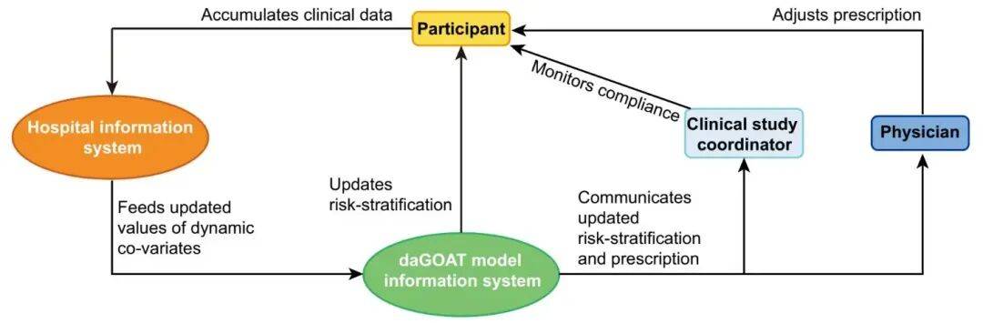 于是,研究团队开展单臂前瞻性临床试验,将中国医学科学院血液病医院(中国医学科学院血液学研究所) 100% 自主开发的条件式自主 AI 模型“ daGOAT [3] 嵌入医院信息系统; AI 模型每天自动读(抓)取造血干细胞移植患者体内多维度、动态变化的血液细胞组成、血液生化、炎症因子等上百项指标数据; AI 模型像资深医生一样“思考”何时该增加免疫抑制剂的剂量,以及增加多少剂量最合适。