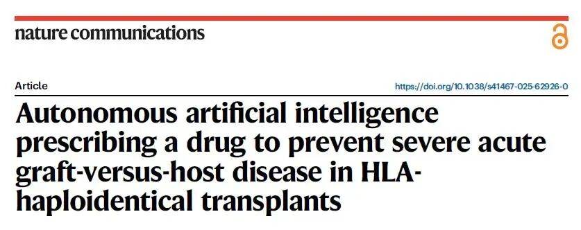 2025 9 25 日, 中国医学科学院血液病医院(中国医学科学院血液学研究所)陈俊仁 / 姜尔烈团队在《 Nature Communications 》杂志发表题为“ Autonomous artificial intelligence prescribing a drug to prevent severe acute graft-versus-host disease in HLA-haploidentical transplants ”的文章,首次报道条件式自主 AI 开立药物处方的临床实践[1]