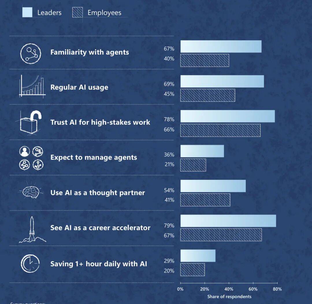 当前存在显著的“认知差距”:67%的领导者熟悉AI智能体(普通员工仅40%),79%的领导者认为AI可加速职业发展(普通员工仅67%),36%的领导者预期未来管理智能体(普通员工仅21%)。但这一差距也为新人创造了机遇:某初创公司未招聘CMO,而是让初级营销人员通过AI运营全流程推广;前沿企业中,入门级员工入职即参与智能体管理,无需长期积累即可接触核心业务。