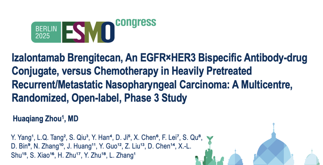 2025年欧洲肿瘤内科学会(ESMO)年会 创新专场(Developmental Therapeutics Session)将迎来一项重磅发布——百利天恒自主研发的 全球首创(First-in-class)、新概念(New concept)创新药物——iza-bren(EGFR × HER3 双抗 ADC) 在R/M NPC中的III期随机对照研究(LBA35,BL-B01D1-303研究)结果将于10月19日(德国柏林时间)揭晓。