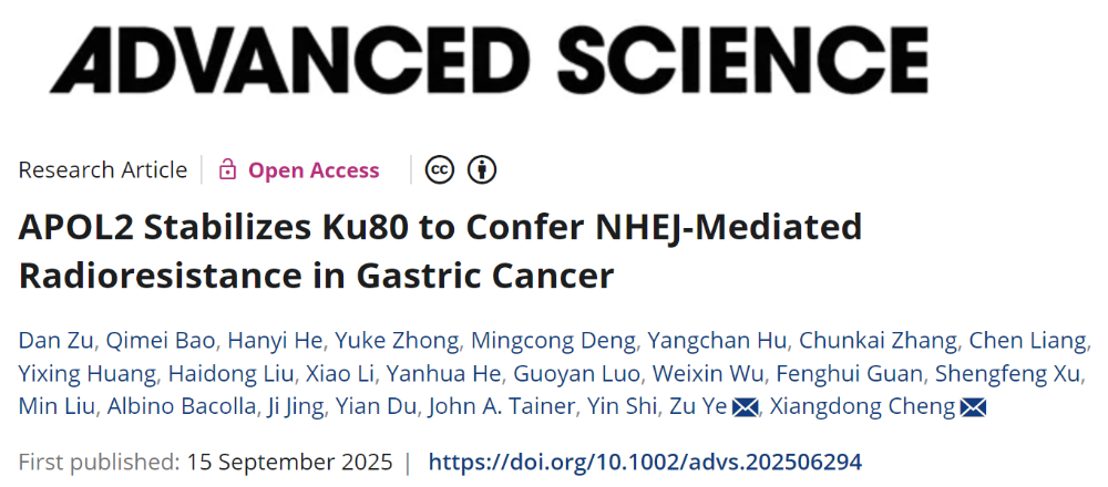 中国好声音丨程向东/叶足团队揭示胃癌放疗抵抗新机制:APOL2-Ku80轴激活NHEJ修复造成肿瘤放疗耐受