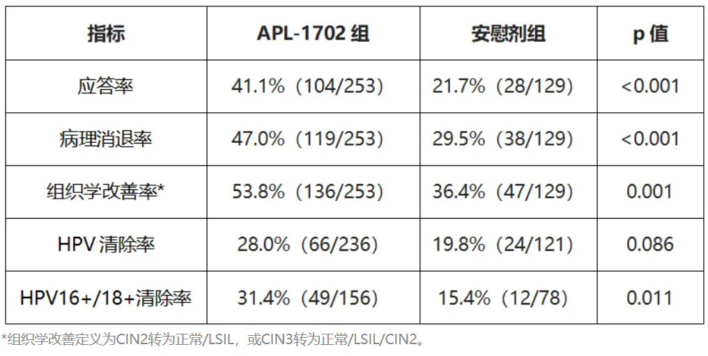 首次治疗3个月评估细胞学和HPV检测,若提示为低级别鳞状上皮内病变(LSIL)及以上或HPV阳性患者,可给予第2次治疗。主要终点:6个月应答率,定义为组织学正常或LSIL伴HPV清除。次要终点:6个月HPV清除率(Cobas®HPV检测);病理消退率(LSIL或正常);安全性。APL-1702治疗组额外进行6个月的扩展期观察,扩展性终点为12个月时的应答维持率及延迟应答率。