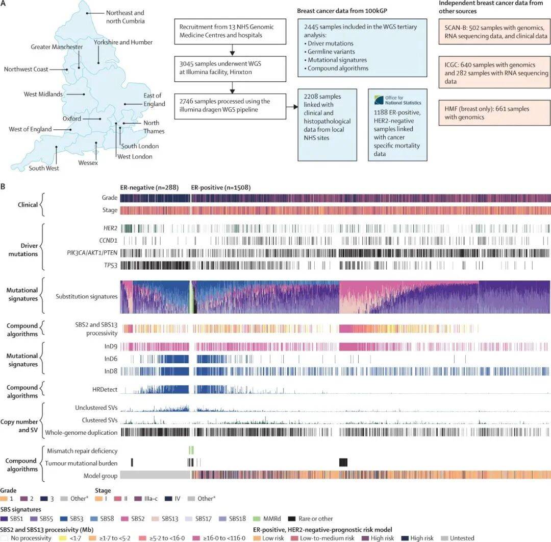 2025年10月7日,英国剑桥大学等机构在《柳叶刀·肿瘤学》发表了一项大规模回顾性研究,首次将全基因组测序数据与英国乳腺癌患者死亡统计关联分析。该研究纳入了2012-2018年英国“十万基因组计划”中2403例患者的2445个肿瘤样本,覆盖所有分期和分子亚型。