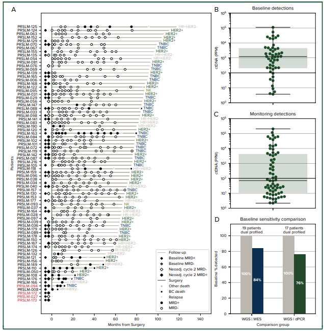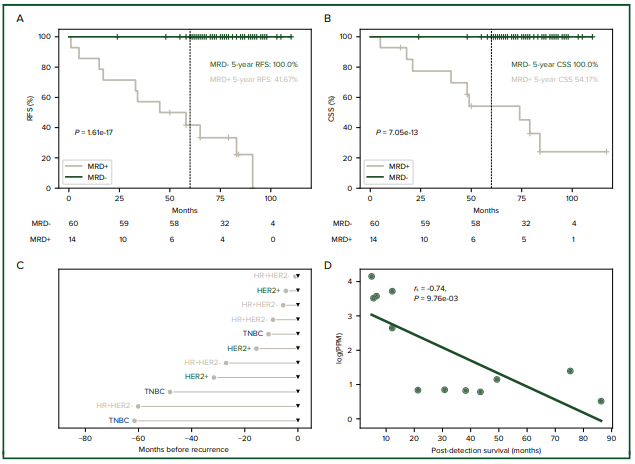 如果说第一项研究聚焦于预后,那么今年2月《肿瘤学年鉴》发表的研究则着眼于复发监测。该研究基于全基因组测序驱动的ctDNA检测平台,实现了早期乳腺癌分子残留病灶(MRD)的超高灵敏度监测 。