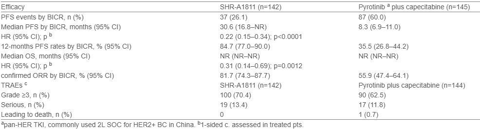SHR-A1811 组中位随访时间为 15.9 个月(95% CI  14.6-17.1),吡咯替尼联合卡培他滨组为 15.3 个月(95% CI 14.3-16.6)。