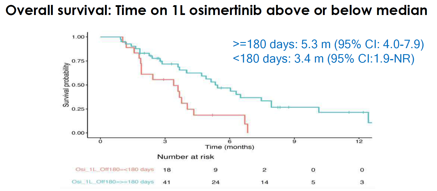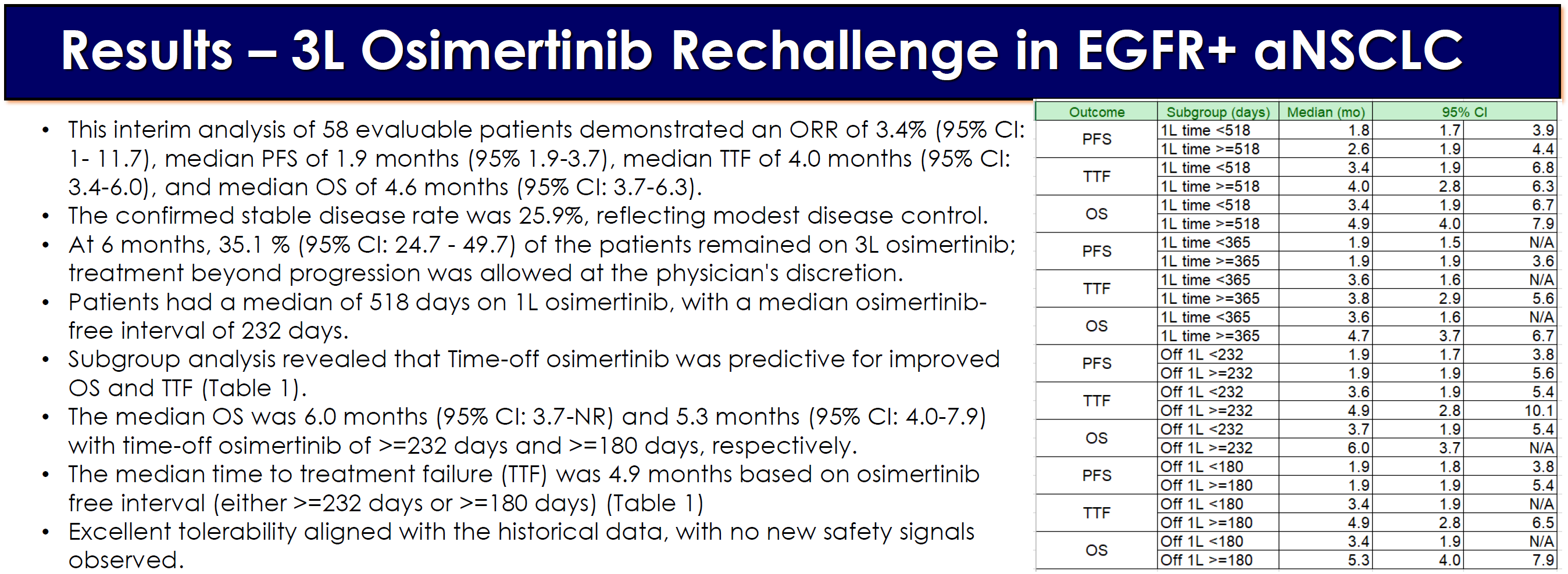 一线EGFR-TKI治疗失败且二线含铂双药化疗(铂类联合培美曲塞)治疗失败后,姑息性化疗(如多西他赛)是目前三线(3L)标准治疗方案,但多西他赛的ORR仅7%-15%。三线再次使用EGFR-TKI的治疗策略仍处研究阶段,既往研究提示三线再挑战EGFR-TKI可能对部分患者有益,尤其是那些既往EGFR-TKI持久缓解或经历了长期“无TKI间隔”的患者。奥希替尼是一种高效高选择性第三代EGFR-TKI,无论是单药一线治疗还是一线联合含铂双药化疗治疗,均有显著的OS获益,三线奥希替尼再挑战值得探索。这是一项在加拿大开展的多中心II期临床研究(OCELOT),旨在评估一线接受奥希替尼治疗,二线接受含铂双药化疗治疗失败的EGFR敏感突变阳性晚期NSCLC患者三线奥希替尼再挑战治疗的有效性和安全性,主要研究终点为ORR,关键次要研究终点包括PFS、TTF、缓解持续时间(DOR)、OS和安全性。中期分析显示(n=58),ORR为3.4%,中位PFS为1.9个月,中位TTF为4.0个月,中位OS为4.6个月,确认的SD率为25%。6个月时,仍有35.1%的患者在接受奥希替尼三线再挑战治疗。医生可酌情决定是否在疾病进展后继续治疗。患者接受奥希替尼一线治疗的中位时间为518天(约17.3个月),中位无奥希替尼治疗间隔时间为232天(约7.7个月)。奥希替尼的停用间隔时间与OS和TTF的改善呈正相关。良好的耐受性与历史数据一致,未发现新信号。提示:奥希替尼三线再挑战在部分经历多线治疗的患者中展示出一定的有效性以及有意义的疾病控制。其可预测的安全性特征和CNS活性对特定患者仍是一种具有吸引力的治疗选择。目前正在进行进一步分析,以确定该治疗策略的最佳候选患者。