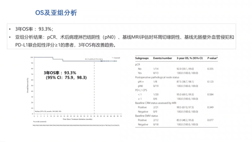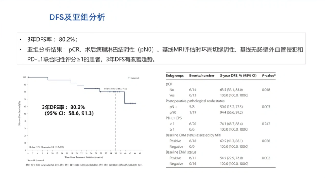 近期,华中科技大学同济医学院附属协和医院团队也公布了其备受关注的II期临床试验(短程放疗联合卡瑞利珠单抗和化疗)的3年生存结果。数据显示,该方案治疗LARC患者的3年无病生存(DFS)率达到了80.2%,3年总生存(OS)率更是高达93.3%。亚组分析进一步提示,基线时达到pCR、术后病理淋巴结阴性、环周切缘(CRM)阴性或壁外血管侵犯(EMVI)阴性的患者,其远期生存获益趋势更为明显。这些积极的远期数据,为“短程放疗+化疗+免疫”这一高效新辅助模式提供了强有力的支持。