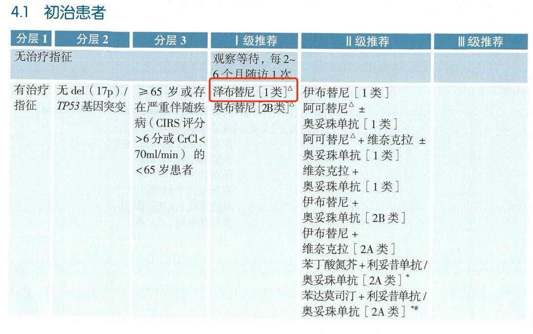 在初治CLL/SLL患者中,对于有治疗指征的患者,无论其是否存在del(17p)/TP53突变,泽布替尼是目前唯一获得全面I级推荐的新一代BTKi[1]