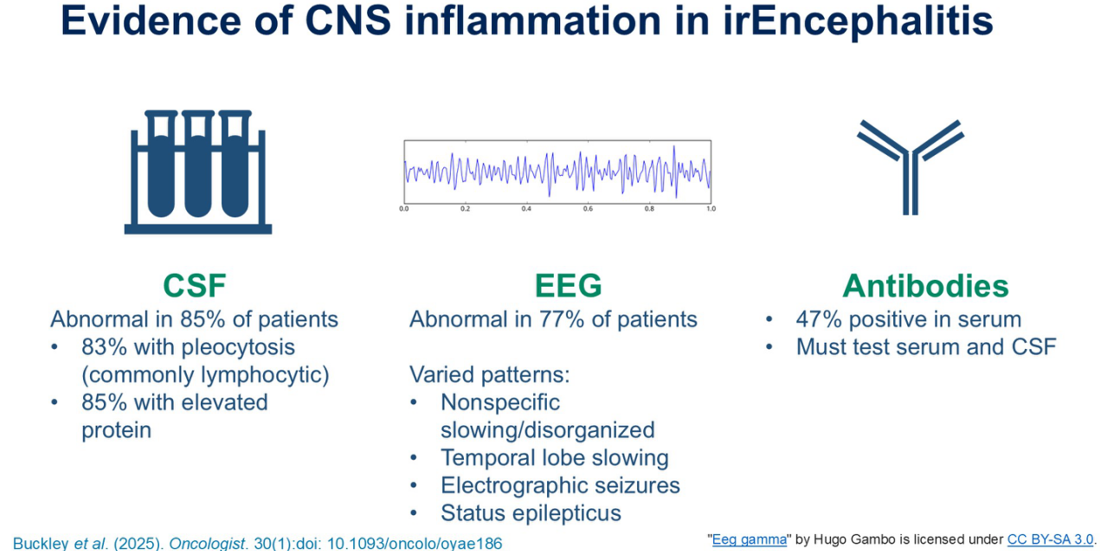 最重要的一点是,不能仅根据症状出现的时间就判断为免疫相关事件,必须首先排除可治疗且需要不同治疗方法的疾病。需警惕单纯疱疹病毒性脑炎,其可在任何年龄段发病,包括使用免疫治疗的患者,因此需要进行评估,并经验性使用阿昔洛韦直至排除。此外,还需考虑其他感染,如隐球菌脑膜炎以及软脑膜癌病。