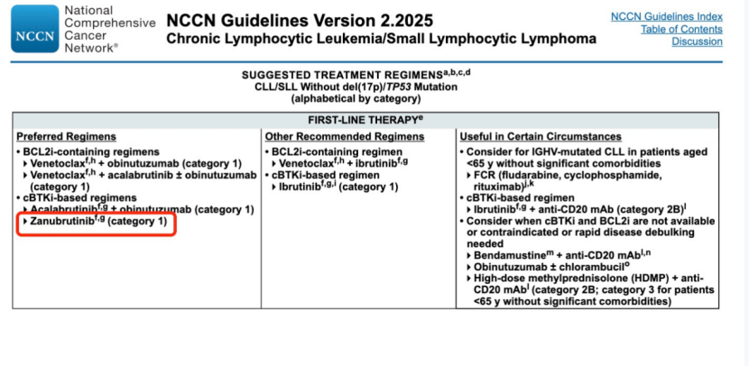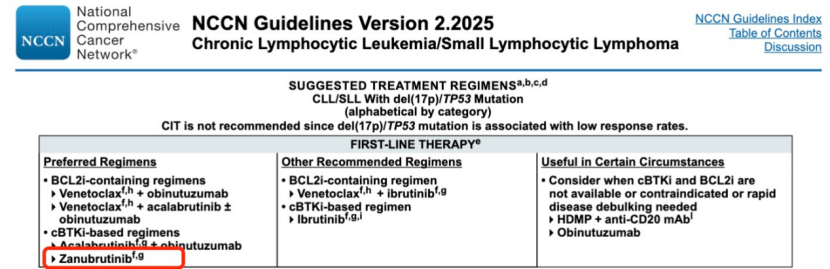 美国国家综合癌症网络肿瘤临床实践指南(NCCN指南)2025 v2版明确推荐泽布替尼作为所有初治(一线)CLL/SLL患者(无论del(17p)/TP53状态、年龄或合并症如何)的优先治疗选择[2]