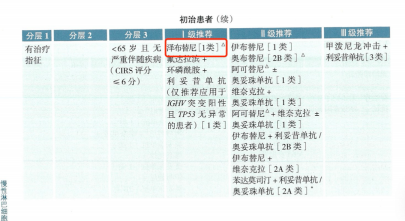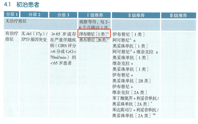 在初治CLL/SLL患者中,对于有治疗指征的患者,无论其是否存在del(17p)/TP53突变,泽布替尼是目前唯一获得全面I级推荐的新一代BTKi[1]
