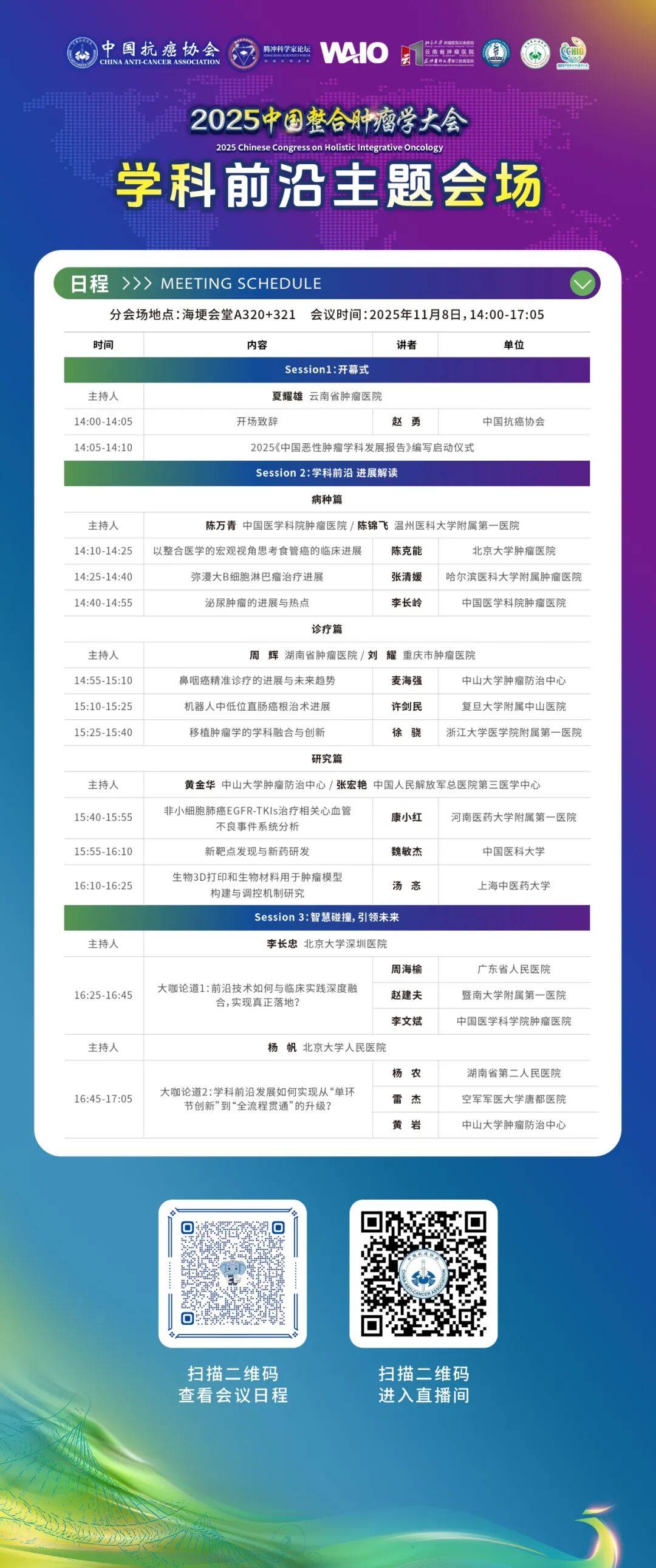 为深入解读学科前沿进展,启迪未来方向,2025CCHIO特设“学科前沿主题会场”,邀请国内外肿瘤领域知名学者,围绕 病种、诊疗与研究 三大方向展开深度交流。会议将以专题报告和话题研讨相结合的形式,回顾年度关键突破,探讨前沿成果的临床转化路径,洞察肿瘤防治未来的创新方向,呈现一场思想与实践并进的学术盛宴。