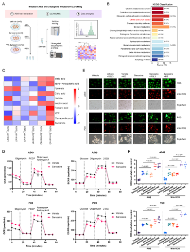 研究表明,肌氨酸能直接与代谢关键酶PDK4结合,抑制其活性,进而解除其对丙酮酸脱氢酶(PDH)的抑制作用。这促使细胞代谢从糖酵解转向氧化磷酸化,导致线粒体内活性氧(ROS)水平升高,为铁死亡创造了条件。