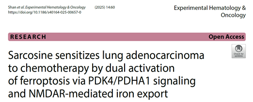 Shan et al. Sarcosine sensitizes lung adenocarcinoma to chemotherapy by dual activation of ferroptosis via PDK4/PDHA1 signaling and NMDAR-mediated iron export. Exp Hematol Oncol 14, 60 (2025).