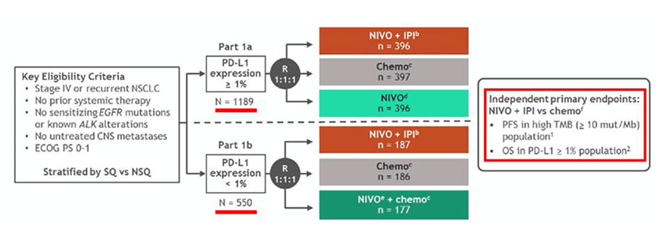 相对地,可能由于当时一线免疫治疗在PD-L1阴性人群中获益证据不足、前景仍不明朗,Part 1b的总样本量被缩减至约540例,主要终点也被改为: PD-L1 < 1%人群中,O+化疗对比化疗的PFS。
