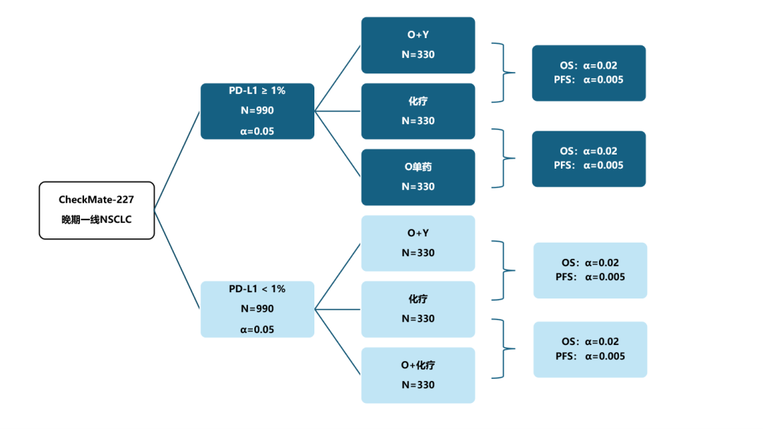 PD-L1 分层 : 主要终点重新变为 O+Y对比化疗,在PD-L1 ≥ 1% 人群中的OS ;如果结果为阳性,则对其下一层级的数个次要终点(在不同PD-L1分层人群中,对比O+化疗/O单药 vs. 化疗)进行层级检验;