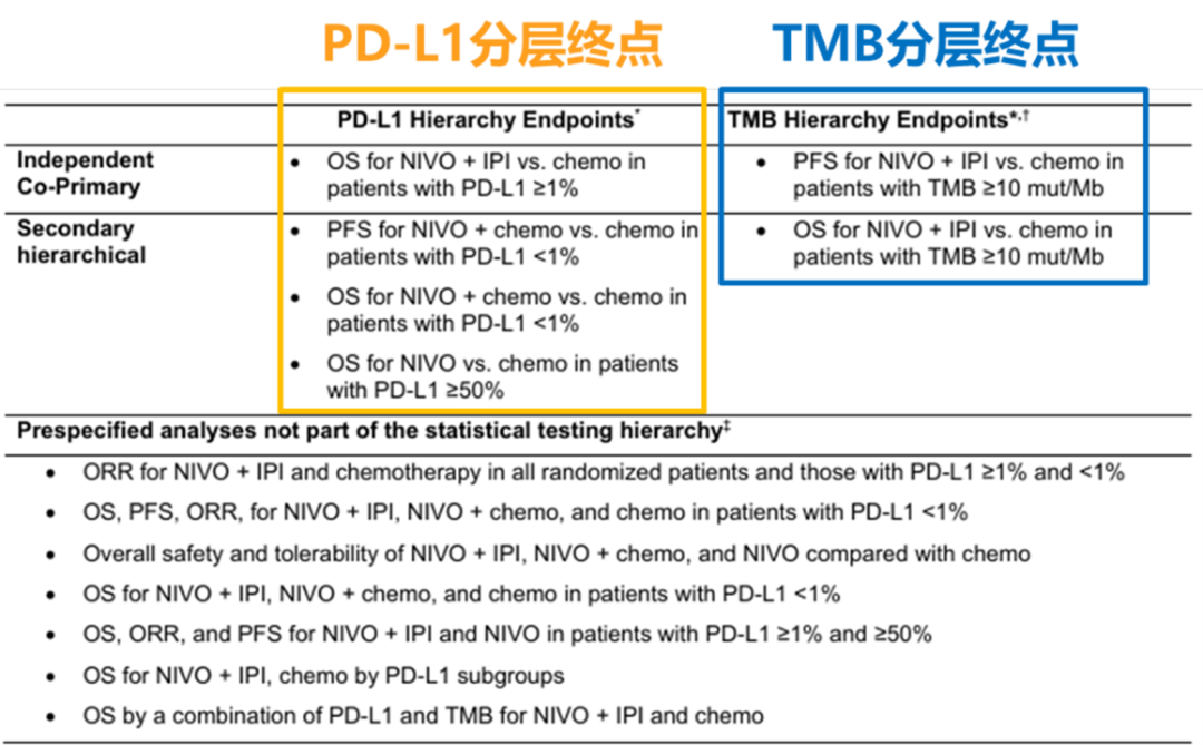 TMB分层: 研究者将另一主要终点设置为 O+Y对比化疗,在高TMB (≥ 10 mut/Mb)人群中的PFS ;如果结果为阳性,则对其下一层级的次要终点——O+Y对比化疗,在高TMB人群中的OS进行层级检验。